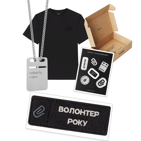 Подаруй своєму Волонтеру чи Волонтерці святковий бокс кращого року. В боксі він чи вона знайдуть особливу футболку, жетон з суперсилою, крутий стікерпак та шеврон, який він чи вона можуть носити прямо на футболці, а може на сумці.
