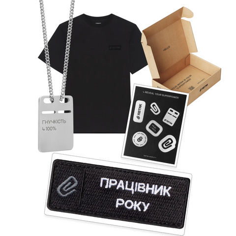 Подаруй своєму Працівнику чи Працівниці святковий бокс кращого року. В боксі він чи вона знайдуть особливу футболку, жетон з суперсилою, крутий стікерпак та шеврон, який він чи вона можуть носити прямо на футболці, а може на сумці.