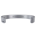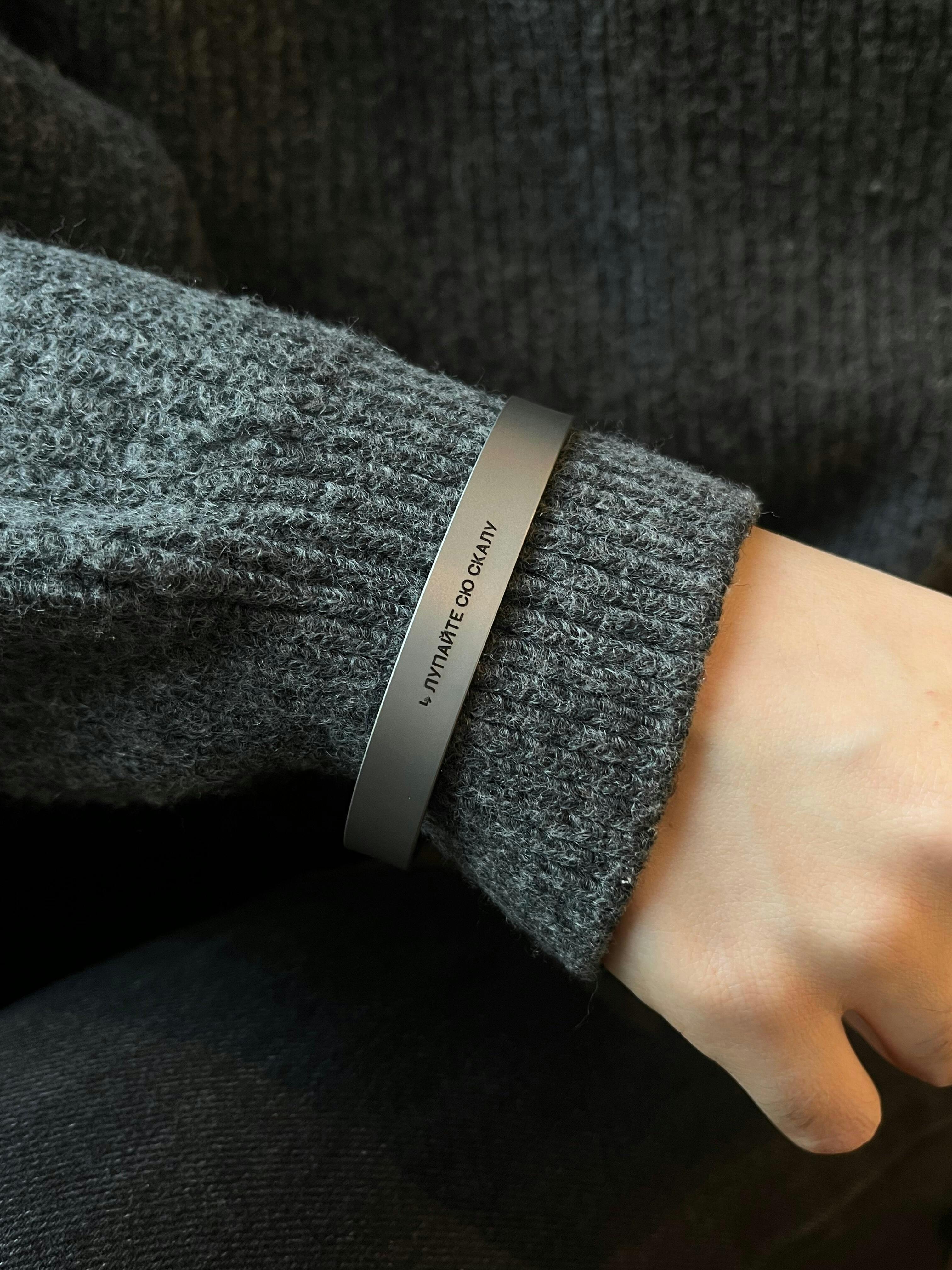 Браслет виготовлений із механічно обробленої нержавіючої сталі з матовим ефектом. Він гіпоалергенний, не темніє і не іржавіє. Це артефакт пам'яті, який має фізичну вагу і форму, і ми доклали багато зусиль, щоб він виглядав і носився якнайкраще.