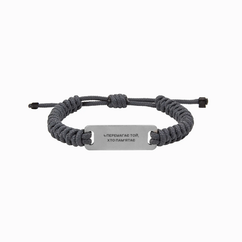 Браслет створено вручну з міцного паракорду — матеріалу, що рятує життя в бойових умовах. У центрі — сталева пластина з гравіюванням “Перемагає той, хто памʼятає”. Це нагадування, що наша пам’ять — це сила, яка перемагає смерть і забуття.